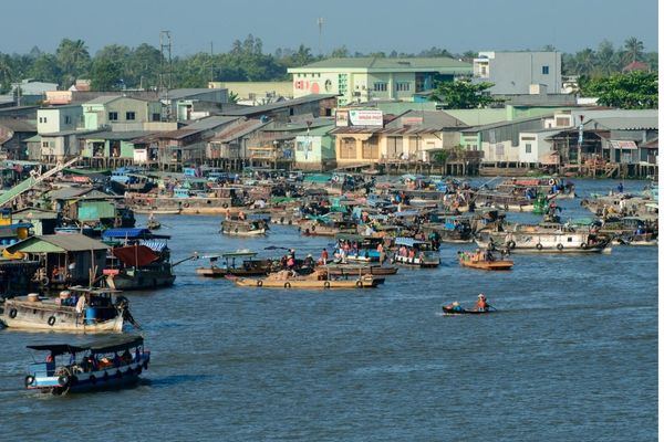 06:00: Early departure by boat to visit Cai Rang Floating Market, the largest and most famous floating market in the Mekong Delta. At this early hour, the market is at its busiest. You will see numerous boats loaded with fruits, vegetables, and agricultural products trading directly on the river. This is an authentic and colorful scene that reflects the traditional river-based commerce of the region.